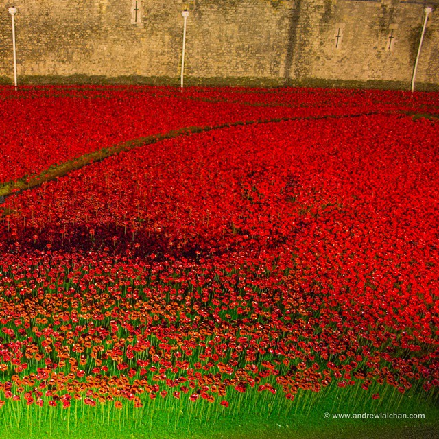 Ceramic poppies at the Tower of London. They have started collecting them…. soon it will be back green. An excellent exhibition to remember the soldiers who died 100 years ago. (at Tower of London)