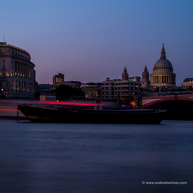 Dusk as the boats pass blackfriars bridge towards st Pauls.