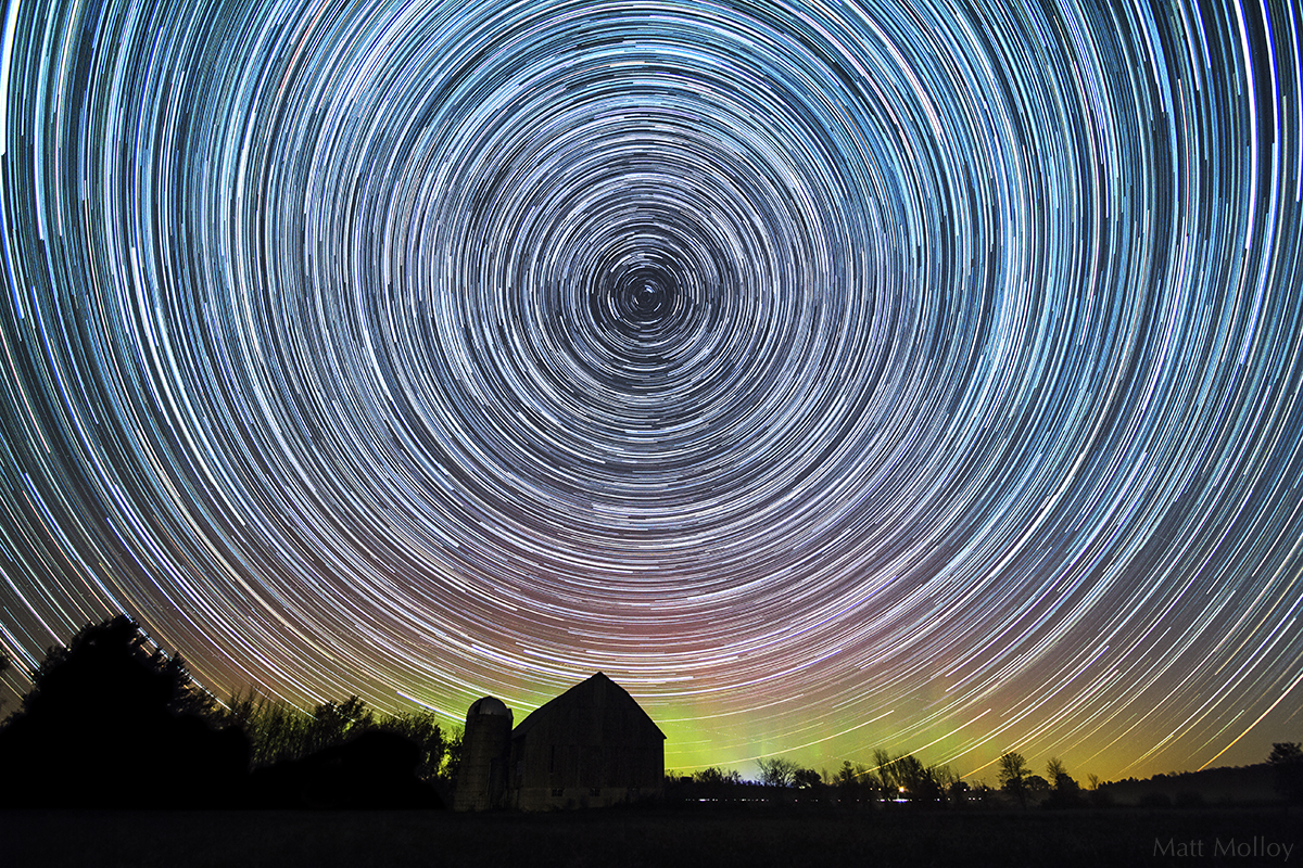 249 photos merged into one image using the lighten layer-blending mode in photoshop. Made from a timelapse of the Northern Lights that I shot on October 8th, 2013. I thought I went far enough out into the field to line up Polaris (the north star) with the peak of the barn roof, but it turns out I went a little too far. I’m just happy I got a few decent timelapses of the Northern Lights. It’s something I’ve only seen a few times in my life.