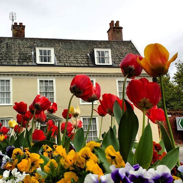Tulips in Bury St Edmunds in full bloom. Taken near the cathedral, in the background one of the classic buildings in the town.#suffolk #burystedmunds #tulip #flower #flowers #flowerstalking #floweroftheday #fleur